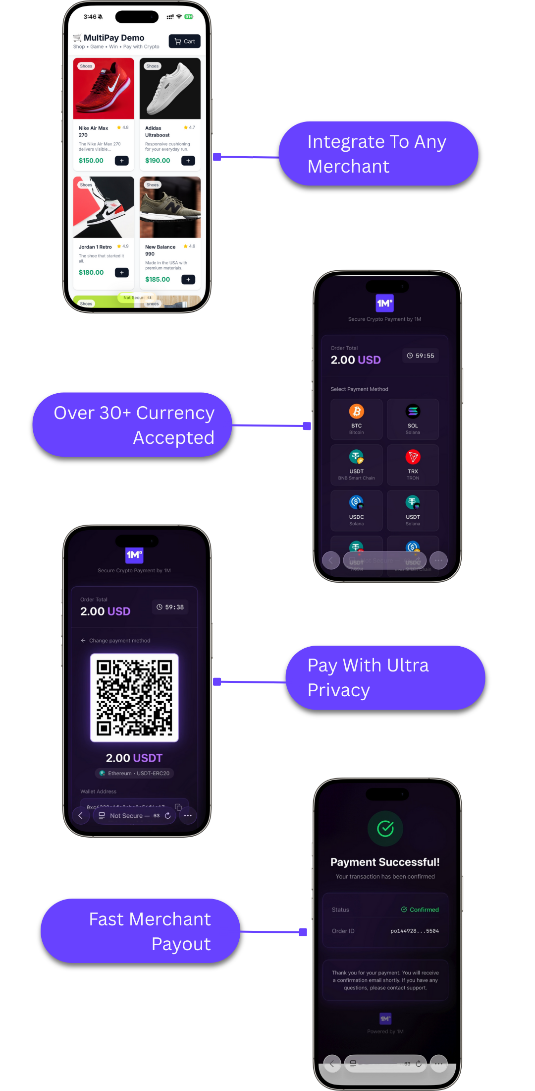 1MPAY enables you to seamlessly accept major cryptocurrencies, most notably USDT, Bitcoin, and Ethereum, providing your customers with flexible payment options in the digital asset space.